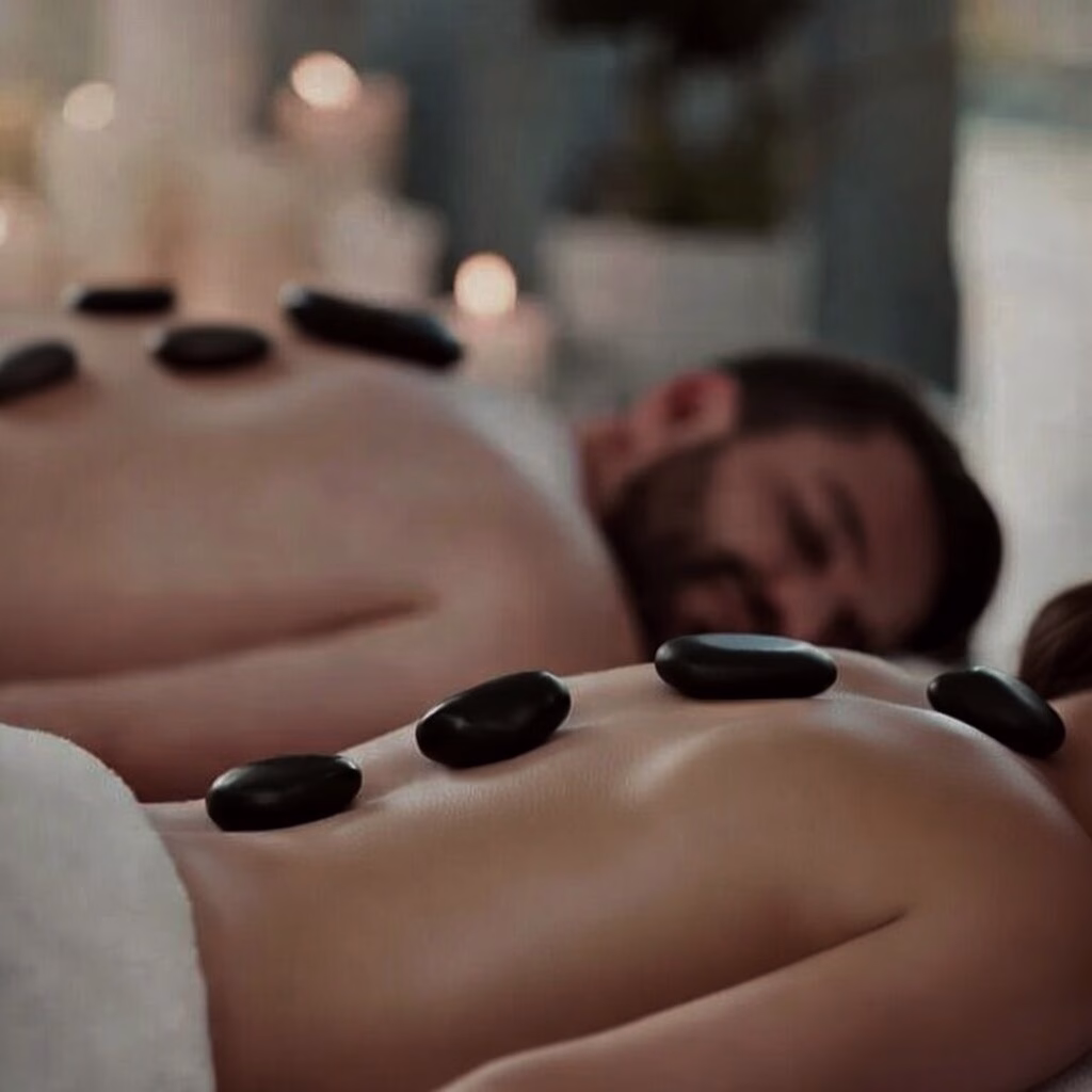 - Kuumakivihieronta kahdelle hellii lihaksia ja sulattaa stressin, tuoden lämpöä ja hyvää oloa koko kehoon. Kuumakivihieronta tehdään kahdelle samassa tilassa yhtä aikaa.